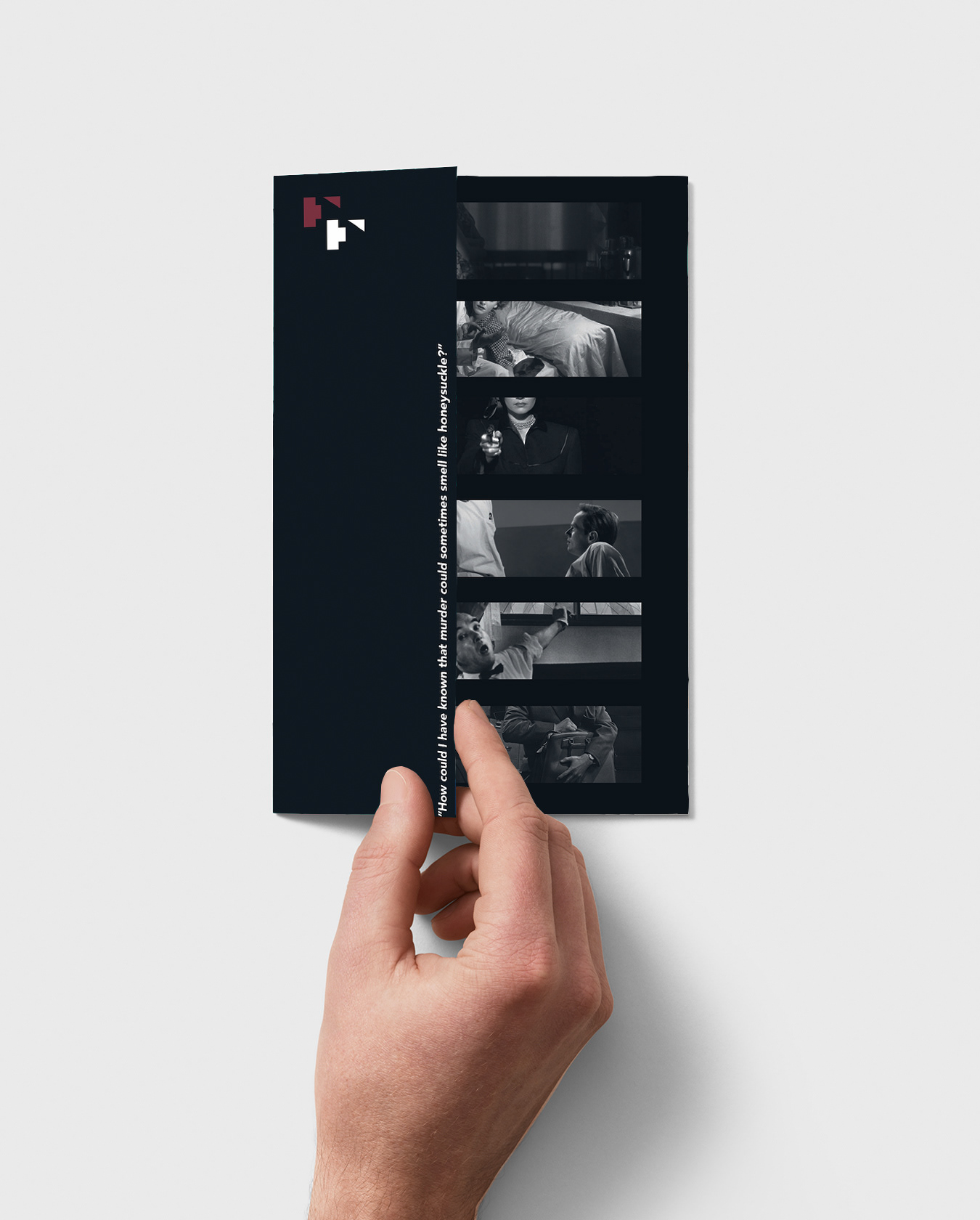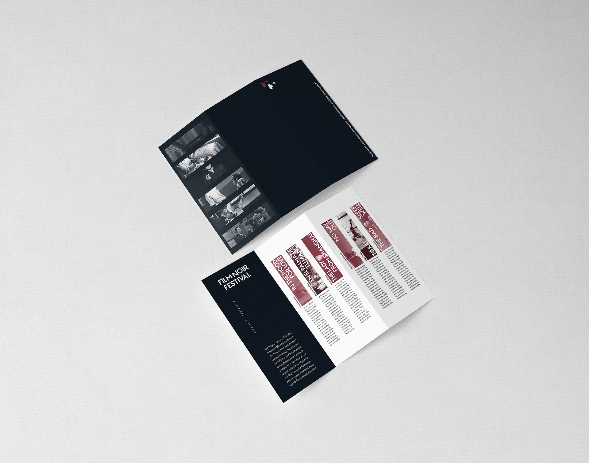 This is a brochure design for the Film Noir Festival. The design is focused on using a grid system as well as using typography to frame the images of each film. This project is made as a duotone project.